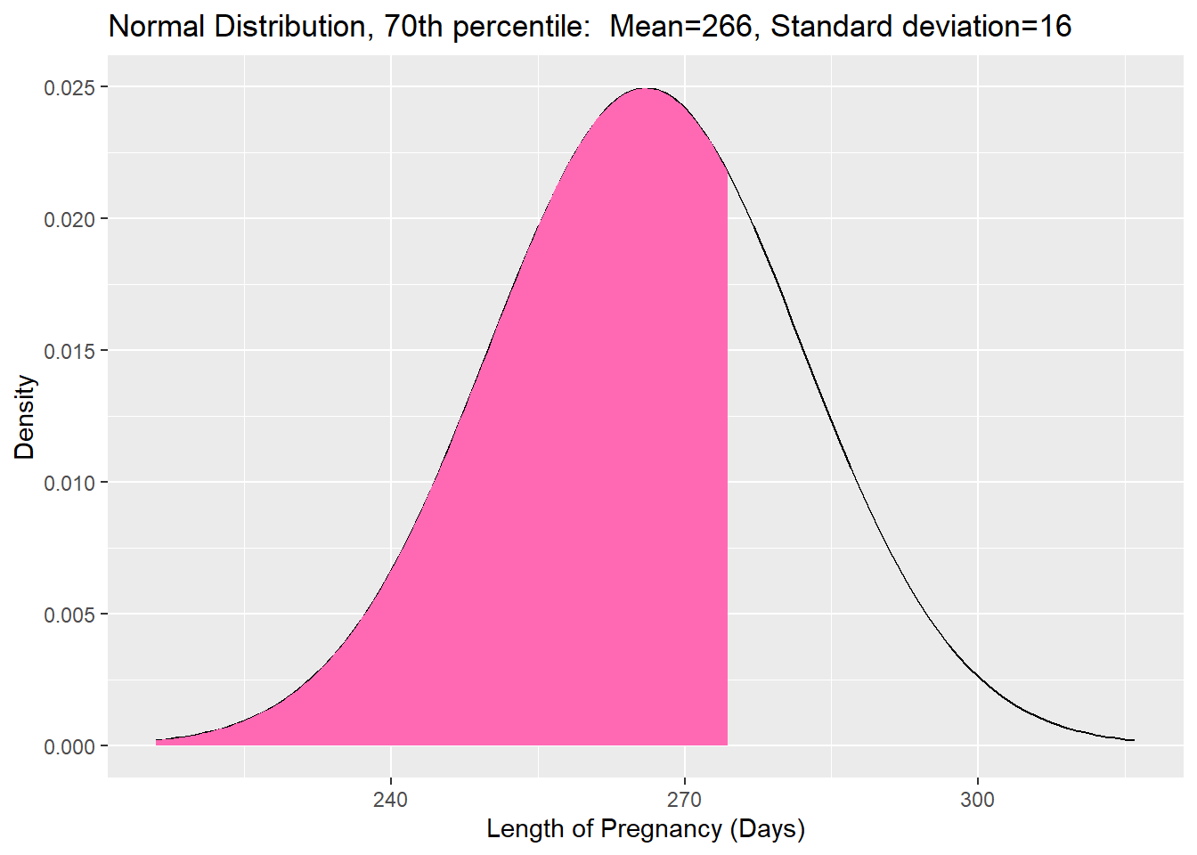 Now that we know the \(z\)-score for the 70th percentile of a standard normal distribution is \(Z=0.52\), and the fact that the distribution of the length of human pregnancies is approx. normal with mean 266 and standard deviation 16, we use the standardization formula to solve for \(X\).