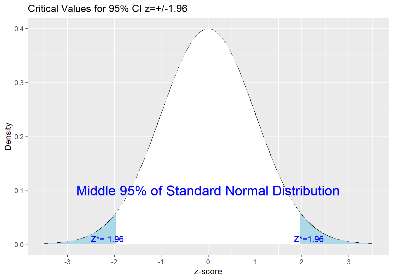 For 95% confidence, the critical value is \(z=\pm 1.96\). This is more precise that the approximately 2 standard deviations that we get from the Empirical Rule. You can this either from the table or by using invNorm(.025) and invNorm(.975) on your calculator.