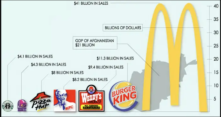Pictographs are attempts to make a graph more visually appealing with some sort of picture. A common flaw is when the intended comparison is amplified by the “area” of the picture. Below, Burger King sales are about 3 times more than Starbucks sales. But since both logos are circular and the area of a circle is \(A=\pi r^2\), the Burger King logo is about 9 times the size of the Starbucks logo, exaggerating the difference between the two companies.
