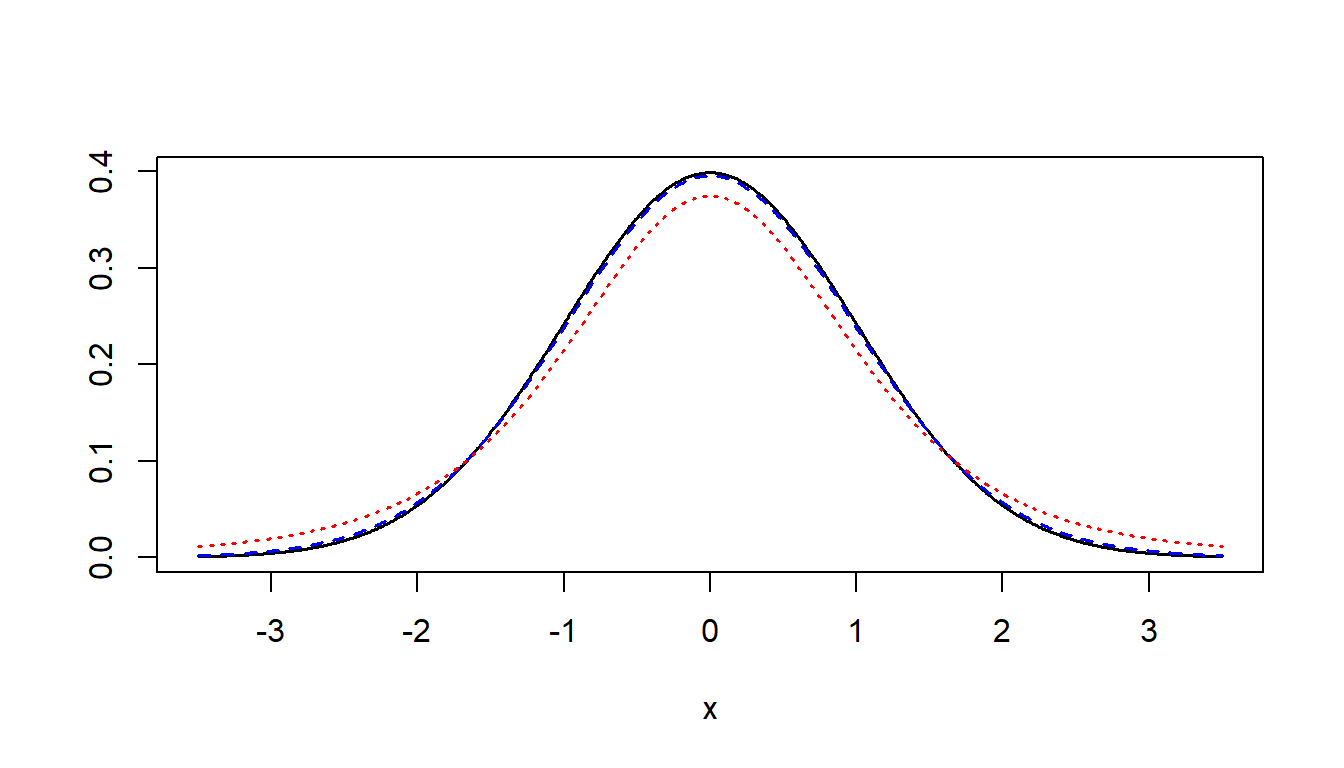 The black line is standard normal, the blue line (very close to the black) is \(t\) with 30 df, and the red line (further from the black) is \(t\) with 4 df.
