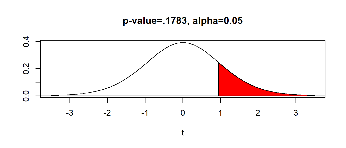 With \(\alpha=0.05\) (area in blue) and \(df=15\), the critical value is \(t^*= 1.753\). Hence, the decision rule is to reject \(H_0\) when the value of the computed test statistic \(t\) exceeds critical value \(t^*\), or reject \(H_0\) if \(t>t^*\). In our problem, \(t=0.951 \not > 1.753=t^*\) and we FAIL TO REJECT the null.