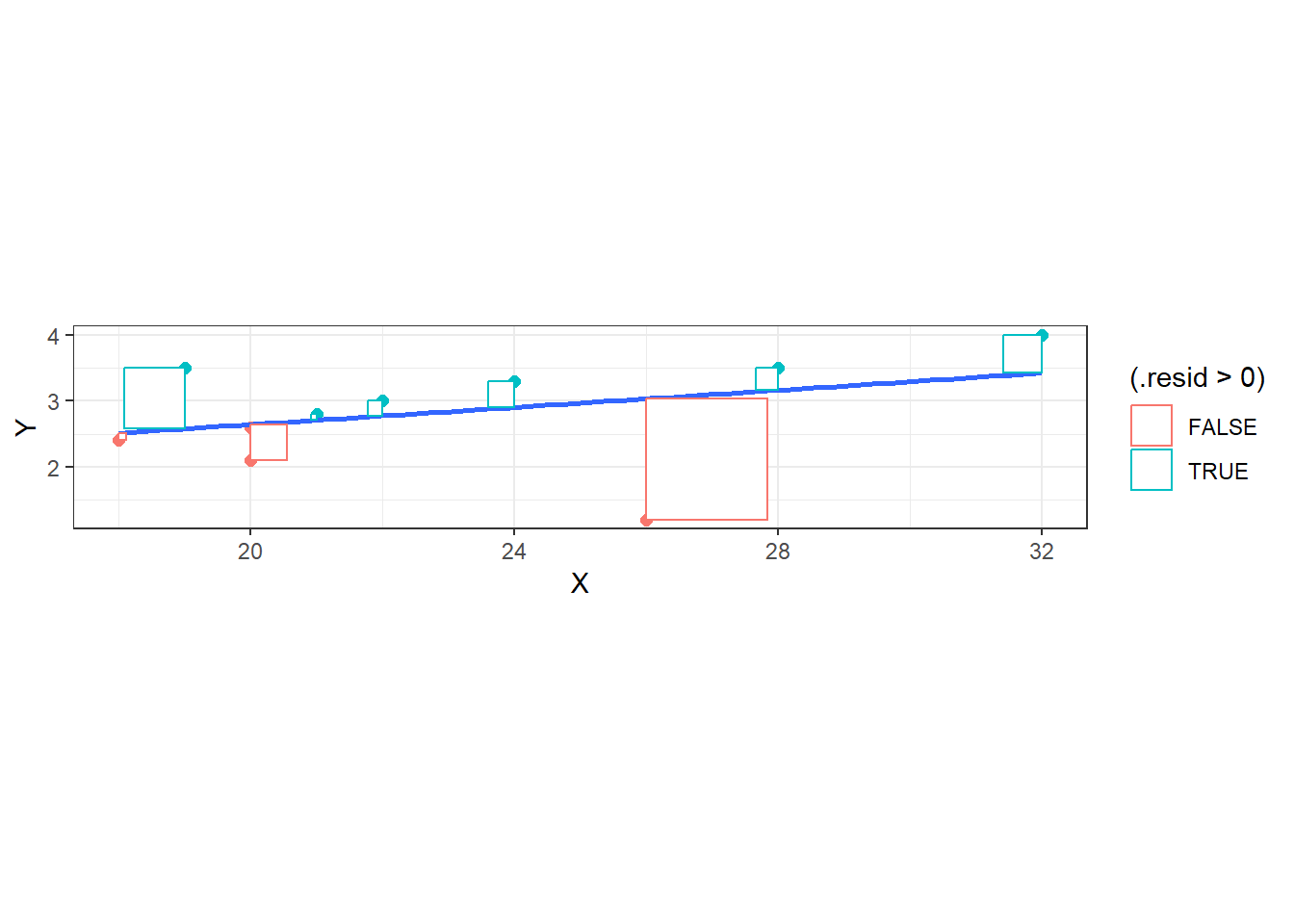The blue least squares regression line is the one that minimizes \(SSR\), represented below as the area of the rectangles. No other line would make the area of those rectangles smaller.