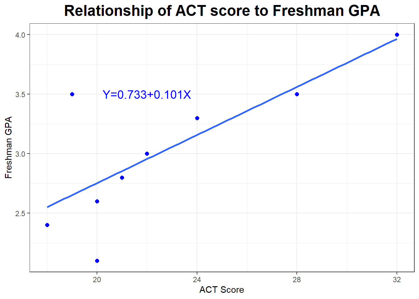 Now the regression model is \[\hat{Y}=0.733 + 0.101 X\] with \(r=.766\) and \(r^2=.587\), indicating that about 58.7% of the variation in GPA is explained by the model using ACT score,
