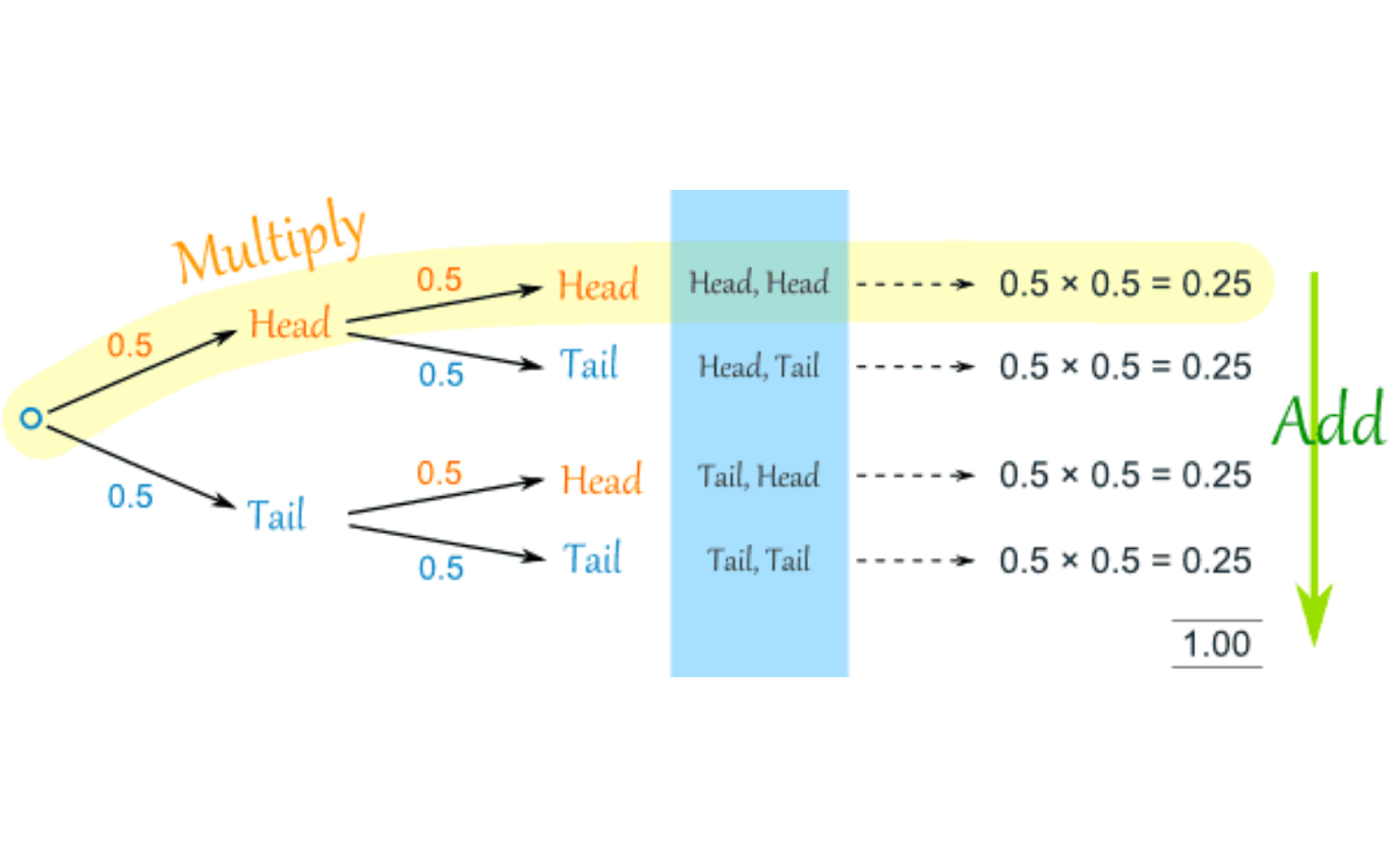 The probability of both events is: \[P(H_1 \quad and \quad H_2)=P(H_1)\times P(H_2)=\frac{1}{2} \times \frac{1}{2}=\frac{1}{4}\].