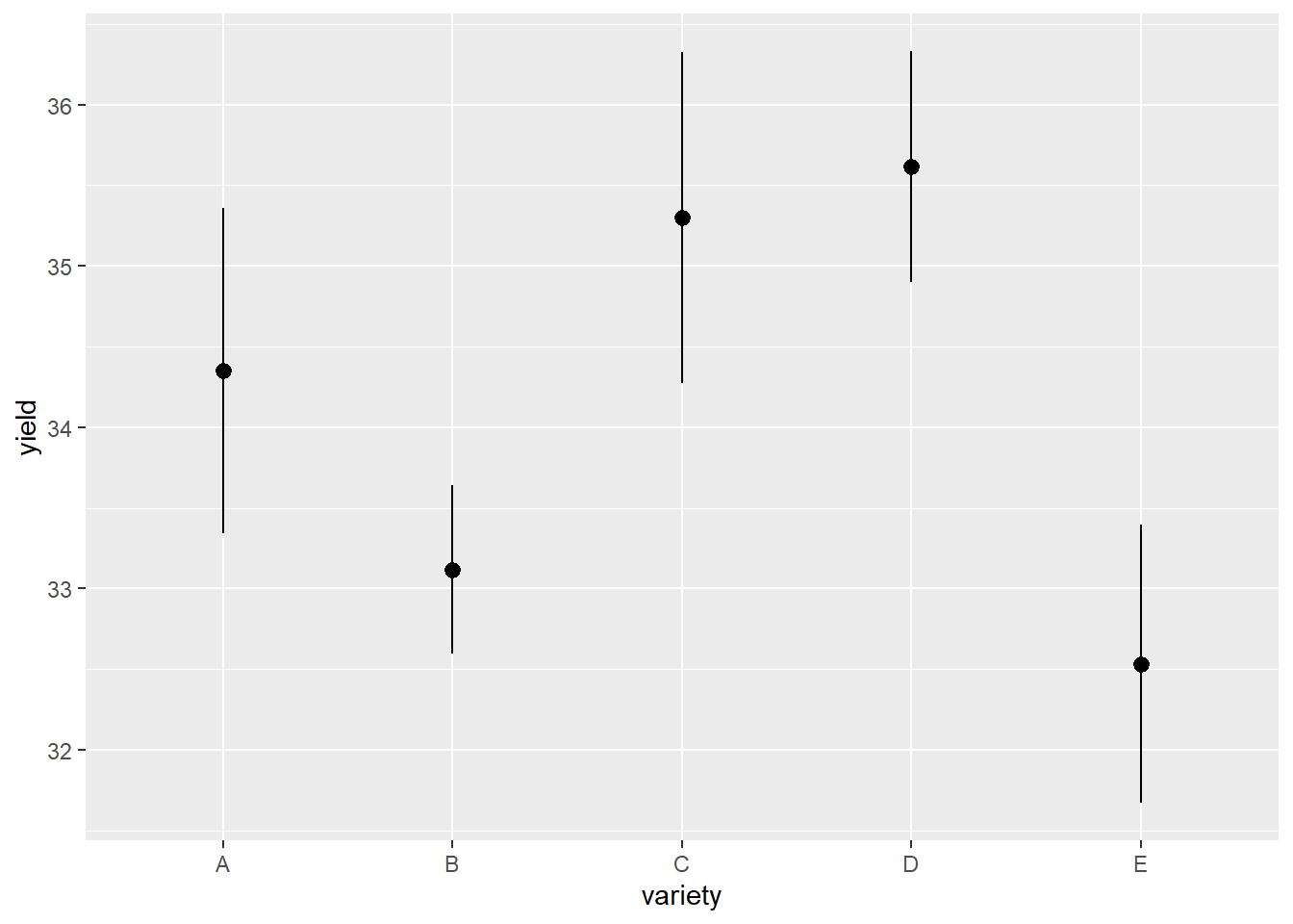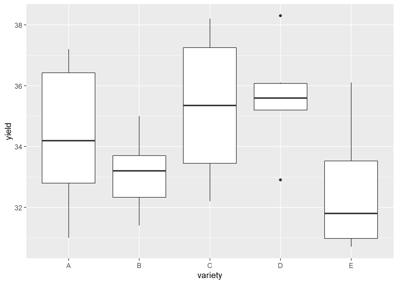 Visually, it looks like varieties C and D are best for maximizing yield, with B and E the worst.