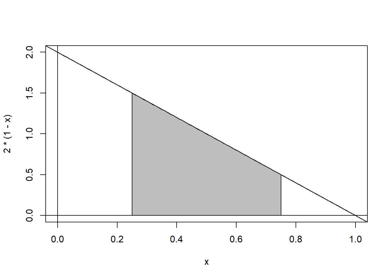 \[ \begin{aligned} P(\frac{1}{4} < X < \frac{3}{4}) = & \int_{\frac{1}{4}}^{\frac{3}{4}} 2(1-x) dx \\ & = (2x-x^2)|_{\frac{1}{4}}^{\frac{3}{4}} \\ & = (\frac{6}{4}-\frac{9}{16})-(\frac{2}{4}-\frac{1}{16}) \\ & = \frac{1}{2} \\ \end{aligned} \]