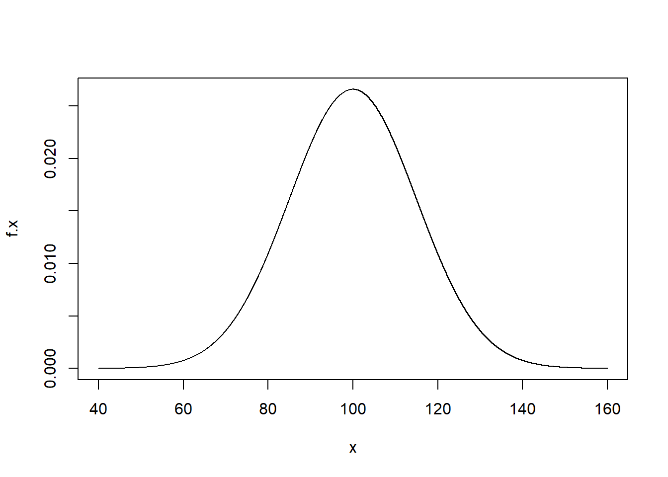 Let’s look at the graph of \(X \sim N(100,15)\), which might describe scores obtained on a so-called ‘IQ’ test.