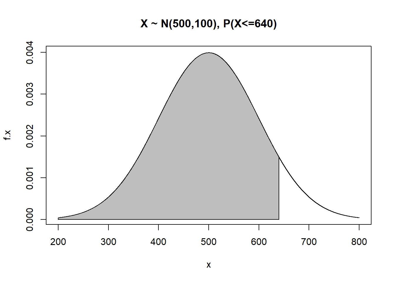 Suppose \(X \sim N(500,100)\) and I want to find the probability of getting a 640 or less on the exam, i.e. \(P(X \leq 640)=F(640)\).
