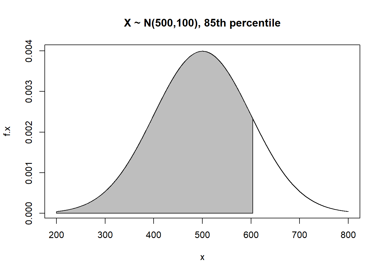 Obviously, the top 15% is equivalent to the 85th percentile or the \(0.85\)-quantile. One way of solving this problem is to find the \(z\)-score associated with the 85th percentile.