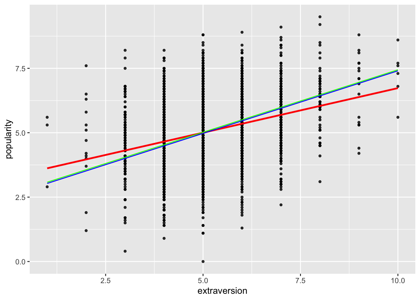 We see that there are some differences in the variance components (that is, in the standard deviations and correlations given under Random effects), and some smaller differences for the fixed effects (this is commonly so). We also see that the ML version gives some additional outputs (log-likelihood, BIC, etc.). These values are not well defined under REML, and hence not given.