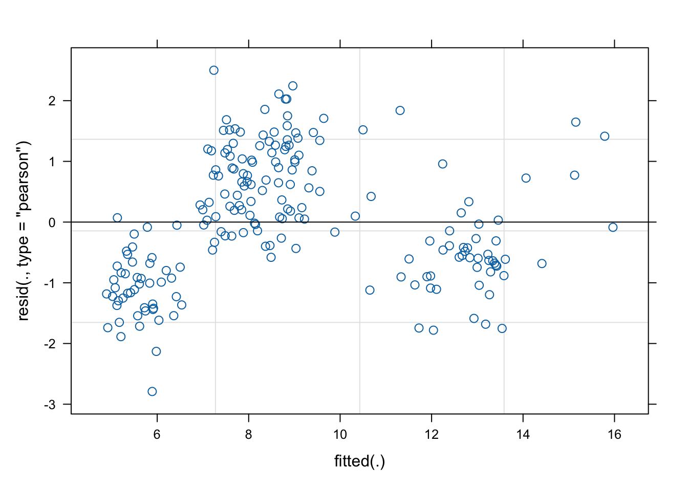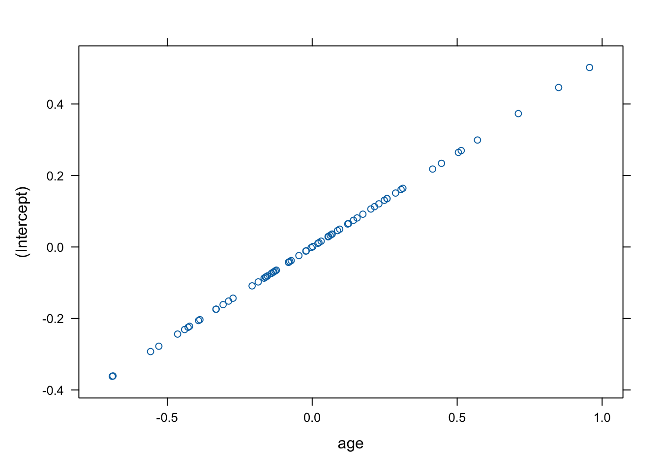 This does not look great, but on the other hand, the normality of the random effects is rather a technical assumption than a modelling assumption. Hence, less perfection of adherence to this assumption is expected as compared to the residual plot.