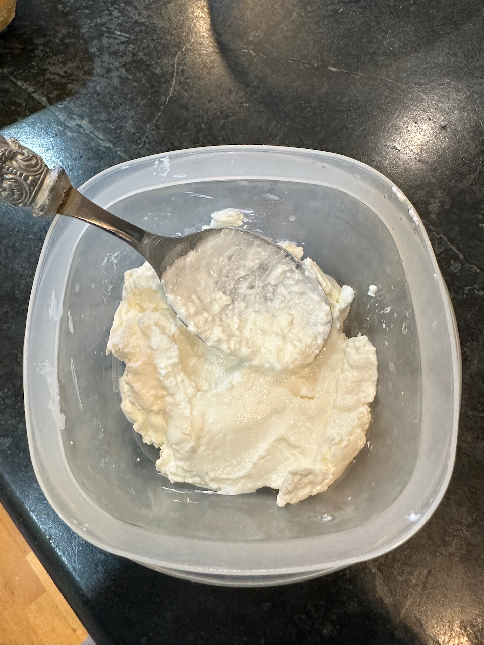 The separated results - greek yogurt on the left and whey on the right. If a thinner yogurt is desired, some of the whey can be whipped into it prior to use.