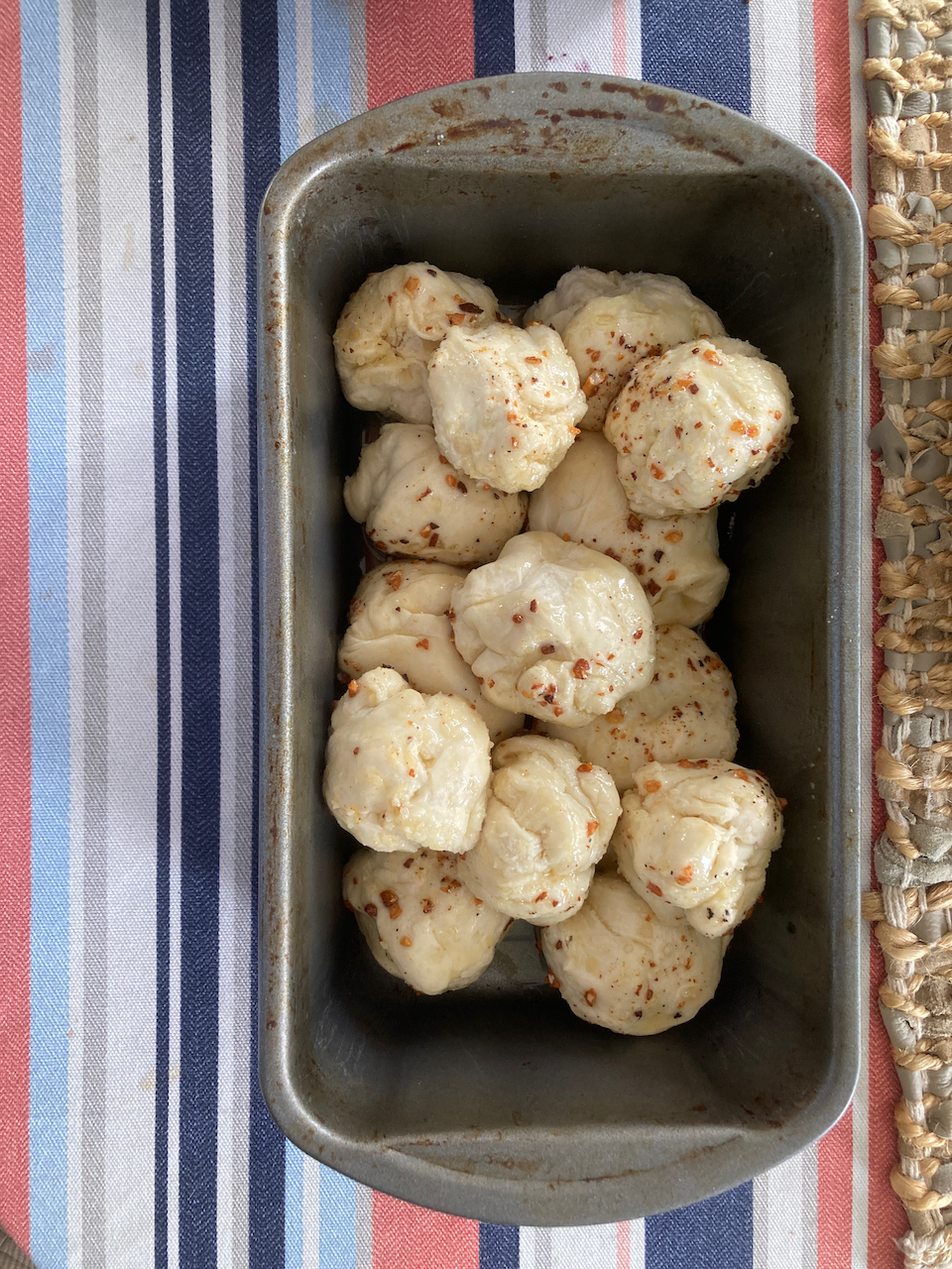 - Shape each piece into a ball by turning up the sides and pinching them together. Arrange in a 9 X 13 inch baking dish dusted with rice flour (either a glass or a ceramic dush will work), cover with a towel, and let rise 3-4 hours.