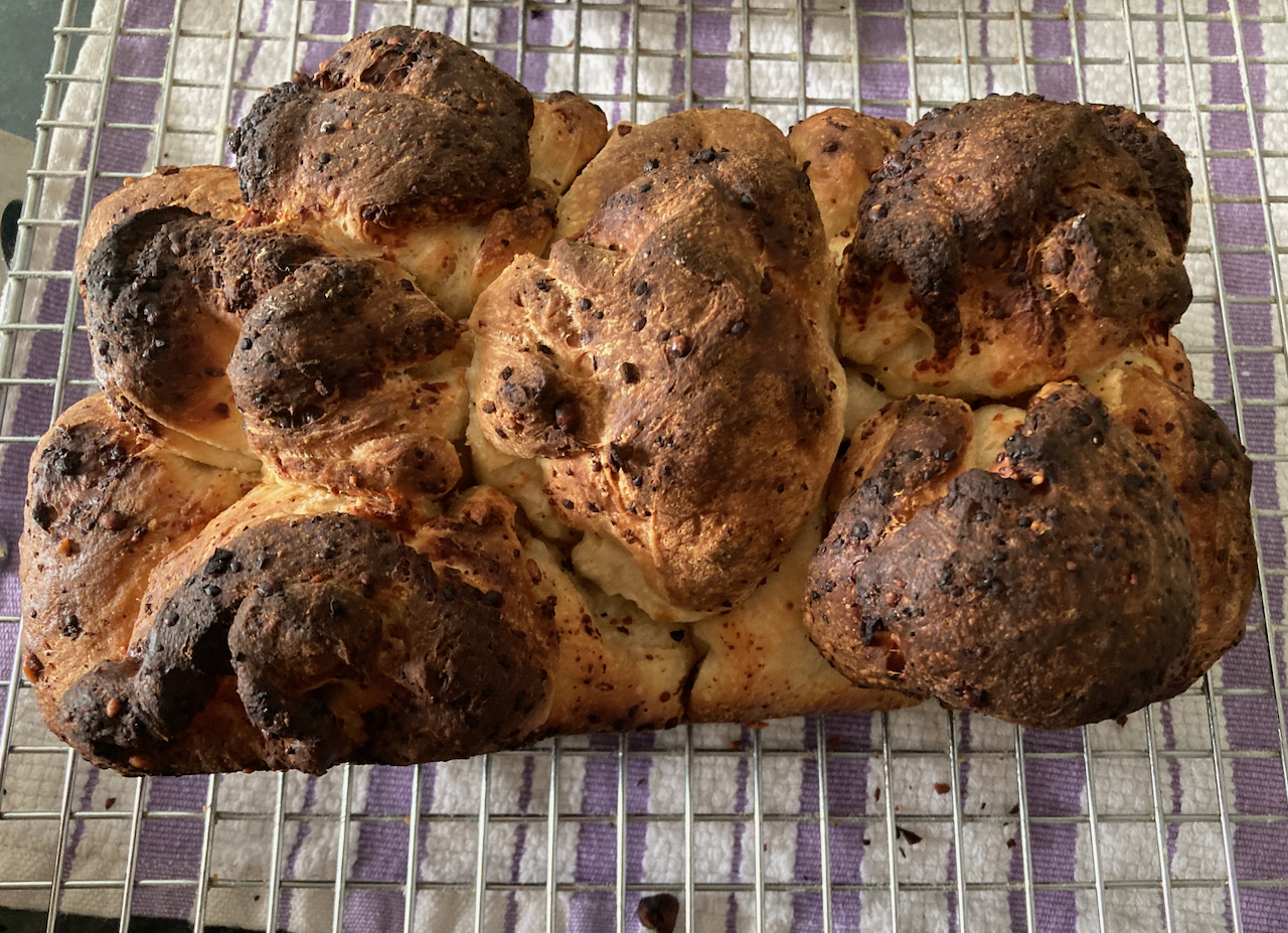 This is a combination of three recipes, the dinner roll recipe we’ve already seen, the recipe from another old but excellent cookbook - A World of Breads by Dolores Casella, and the technique for making cheese breads from Reinhart. We used the first to make the dough and the others to process and bake the dough.