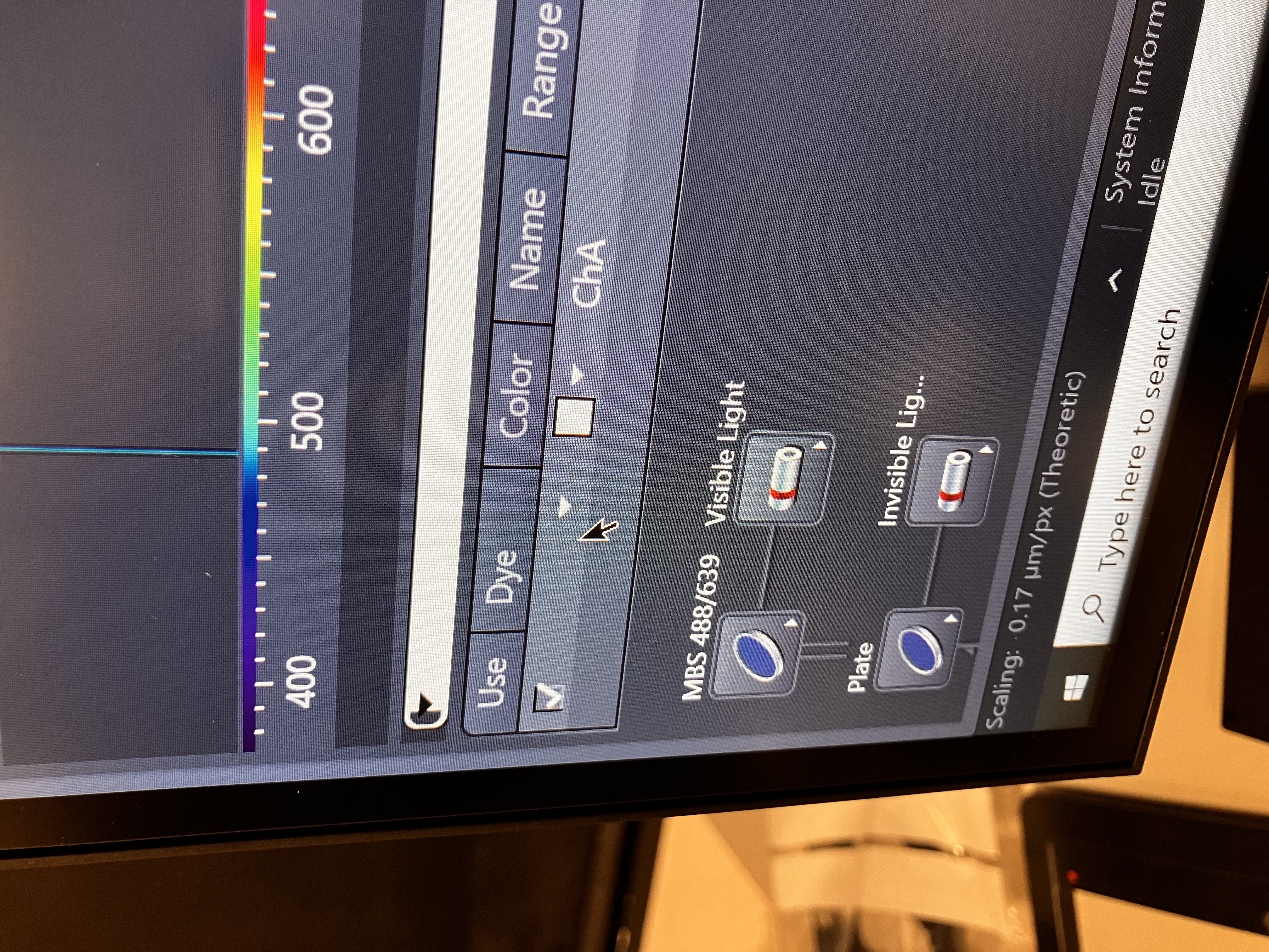 - As mentioned above, you can perform simultaneous acquisition in confocal mode. Within a track, you can add multiple dyes and adjust the corresponding filters accordingly: