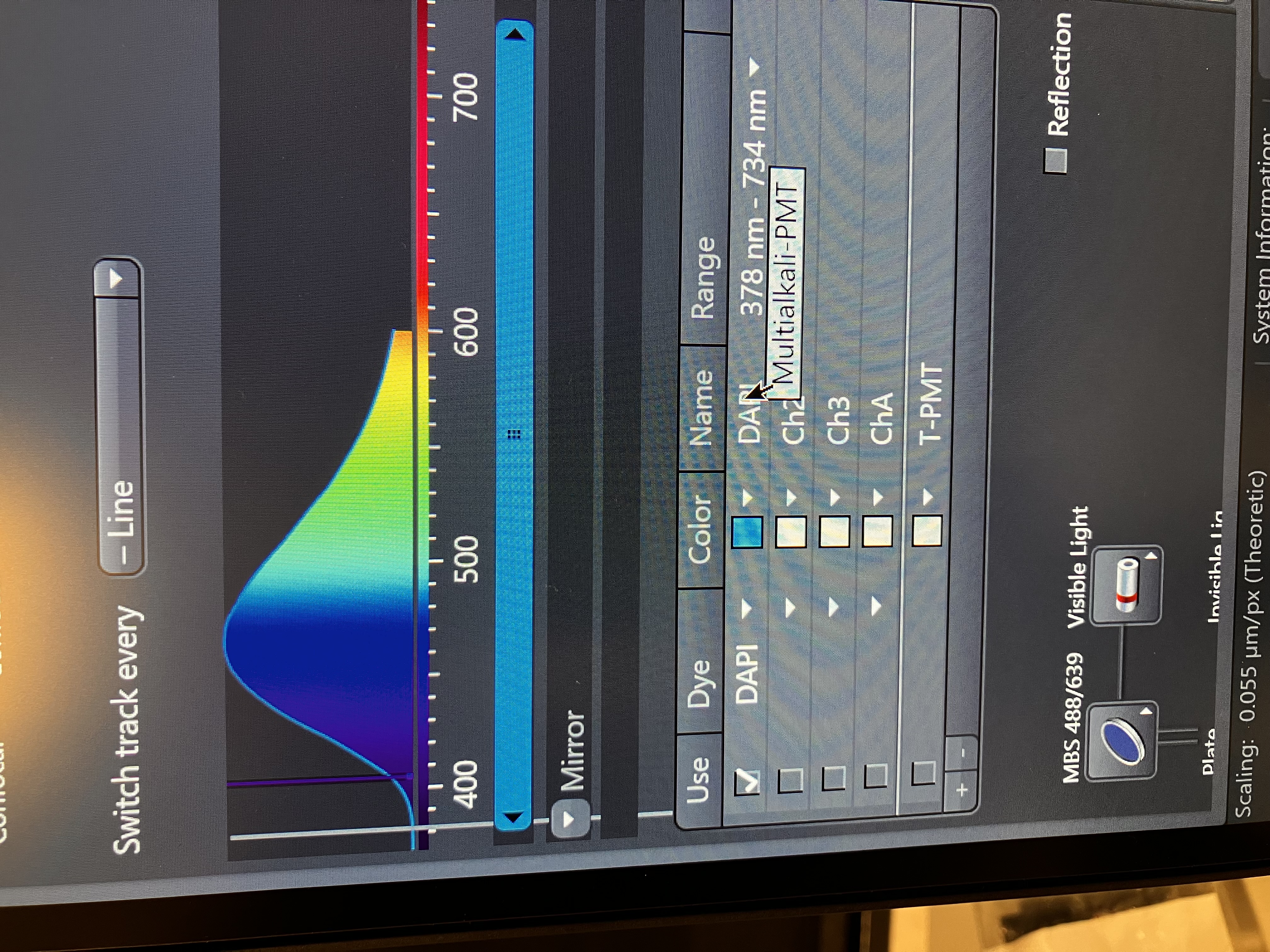 In confocal mode, you can specify which detector is used for each track. Our setup has three detectors: Multialkali-PMTs (assigned to channels 1 and 3), a GaAsP-PMT (assigned to channel 2), and the Airyscan detector (assigned to channel 4). The ladder two are more sensitive, so take fact that into consideration, using this plot: