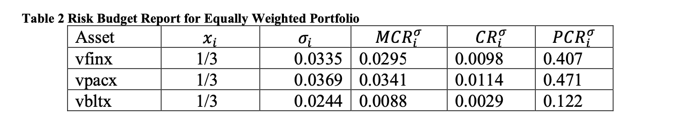 Table 2 below shows a risk budget report for an equally weighted portfolio of vfinx, vpacx and vbltx. The risk budget report shows the additive decomposition of portfolio volatility into contributions from the assets in the portfolio.