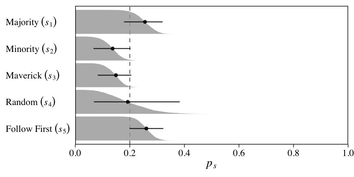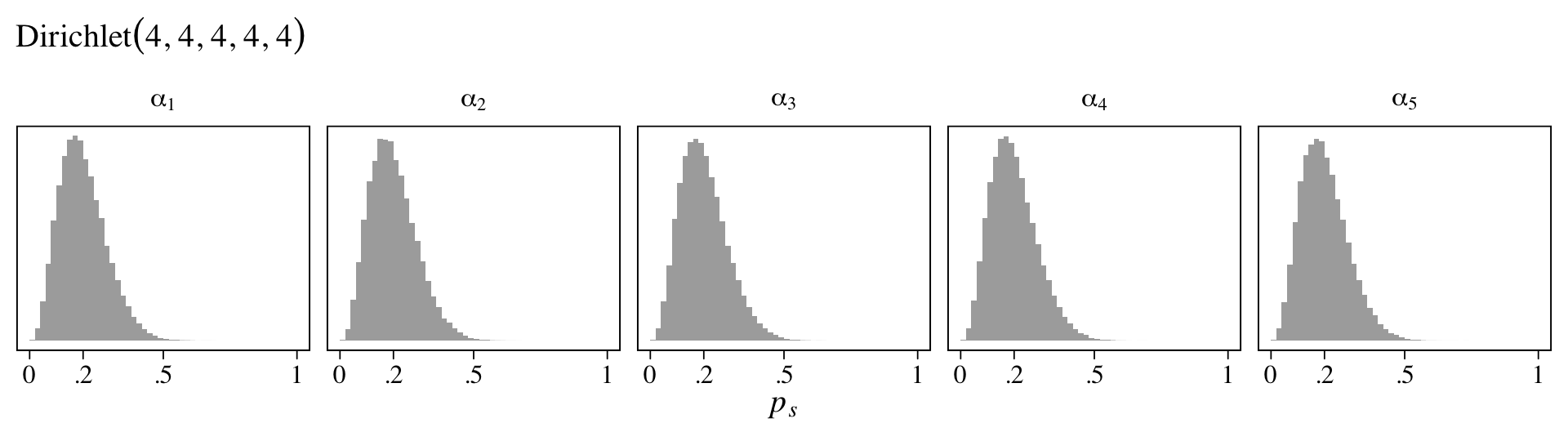 Here the points are the posterior medians and the horizontal lines the quantile-based 50% intervals. Turns out that \(\operatorname{Beta}(2, 18)\) prior for \(p\) pushes the bulk of the prior mass down near zero. The beta distribution also forces the parameter space for \(p\) to range between 0 and 1. If we denote the two parameters of the beta distribution as \(\alpha\) and \(\beta\), we can compute the mean for any beta distribution as \(\alpha / (\alpha + \beta)\). Thus the mean for our \(\operatorname{Beta}(2, 18)\) prior is \(2 / (2 + 18) = 2 / 20 = 0.1\).