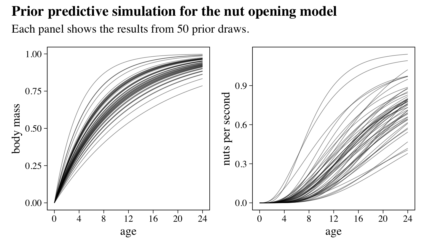 The Log-Normal likelihood ensures the predictions for \(\text{weight}_i\) will always be non-negative. Because our parameter \(p\) is the ratio of radius to height, \(p = r / h\), it must be positive. Since people are typically taller than their width, it should also be less than one, and probably substantially less than that. Our next step will be taking a look at our priors.