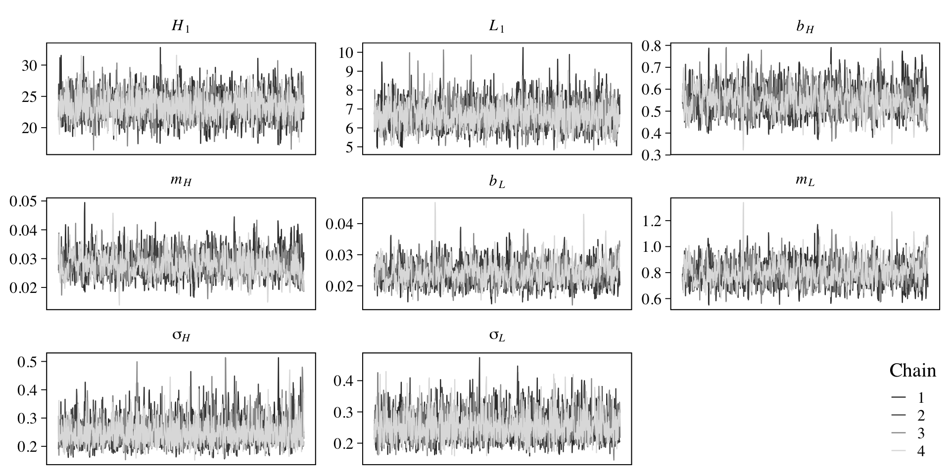 \[\begin{align*} L_t & \sim \operatorname{Log-Normal}(\log \mu_{L, t}, \sigma_L) \\ H_t & \sim \operatorname{Log-Normal}(\log \mu_{H, t}, \sigma_H) \\ \mu_{L, t} & = \alpha_L + \beta_{L1} L_{t - 1} + \beta_{L2} H_{t - 1} \\ \mu_{H, t} & = \alpha_H + \beta_{H1} H_{t - 1} + \beta_{H2} L_{t - 1}, \end{align*}\]
