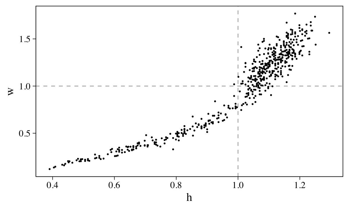 Because we computed our weight and height variables, w and h, by dividing the original variables by their respective means, each now has a mean of 1.