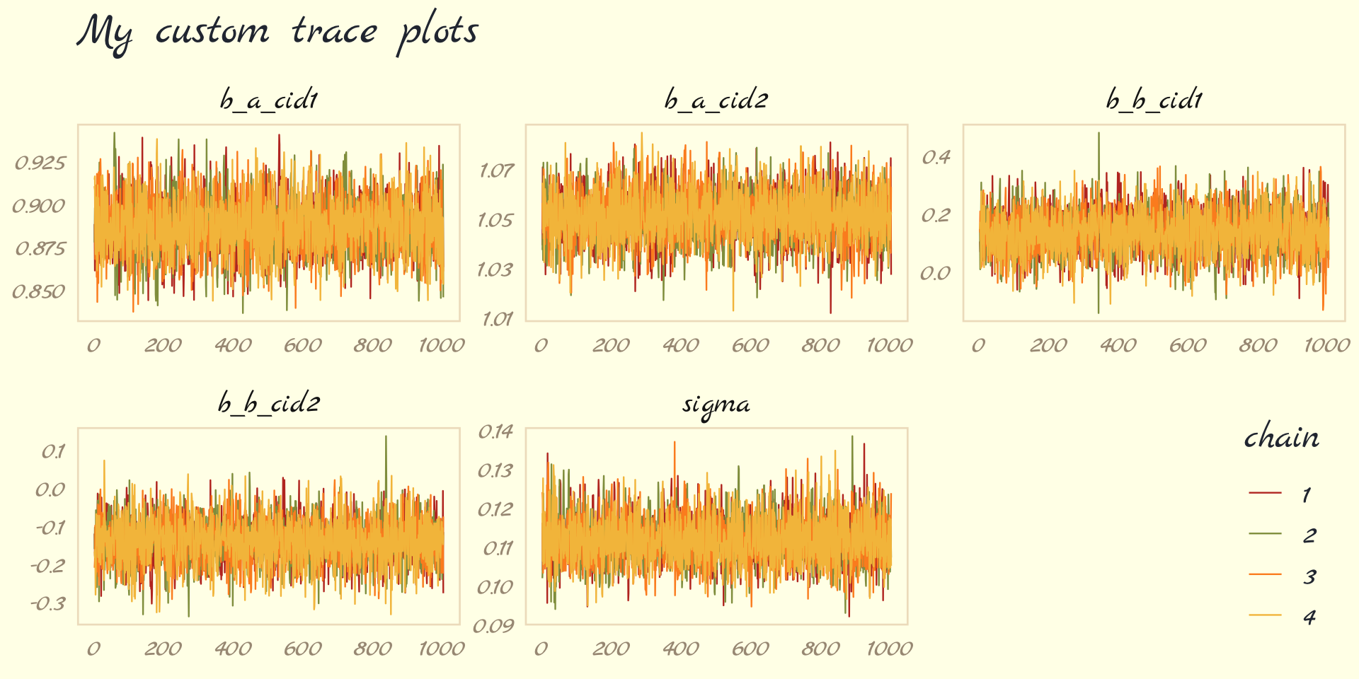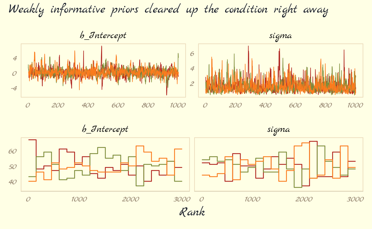 “The estimates for a1 and a2 are better identified now. Well, they still aren’t individually identified. But their sum is identified” (p. 296). Now it’s time to make our version of Figure 9.11. Before we do, one of the challenges we’ll have to overcome is the bayesplot::mcmc_rank_overlay() doesn’t seem to give users an easy way to control the faceting behavior of the plotting function. If you try to simultaneously plot all three model parameters with mcmc_rank_overlay(), you’ll end up with the one row and three columns. But I want the reverse. One solution is to make a custom plotting function. Since we’re juggling both mcmc_trace() and mcmc_rank_overlay(), we’ll make the function do both at once. The trick will be to set the function and workflow up so that we only enter in one parameter at a time. Here’s the function.