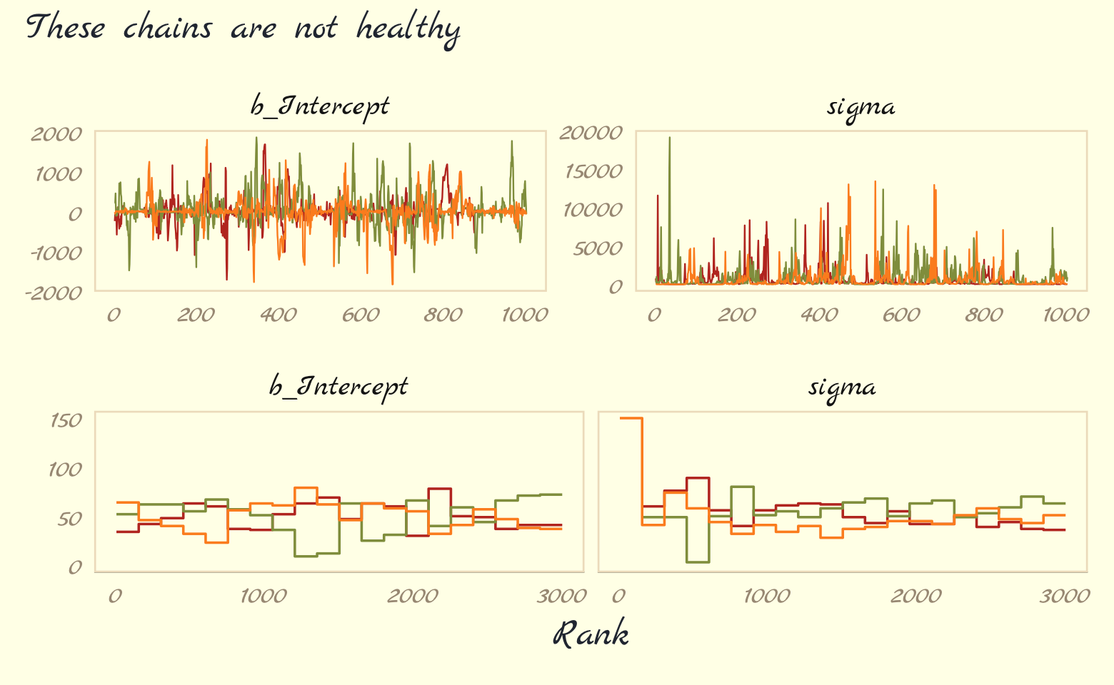 p1 <- trace_rank(data = post, var = "b_a1", subtitle = "b9.4 (bad priors)")