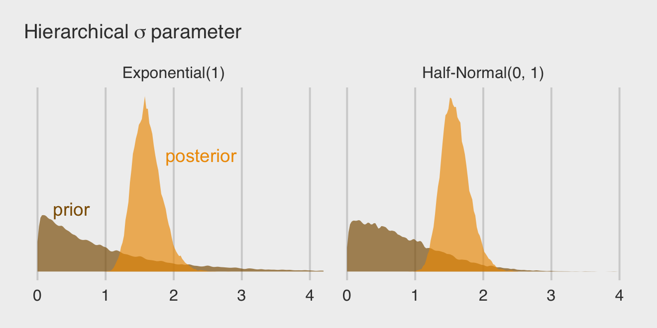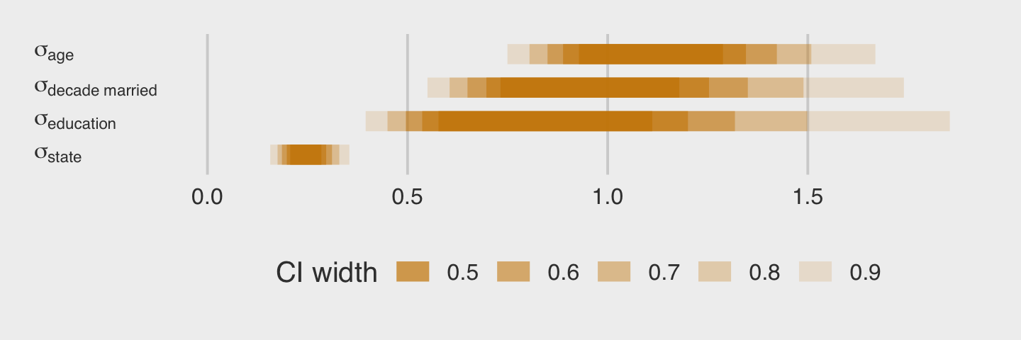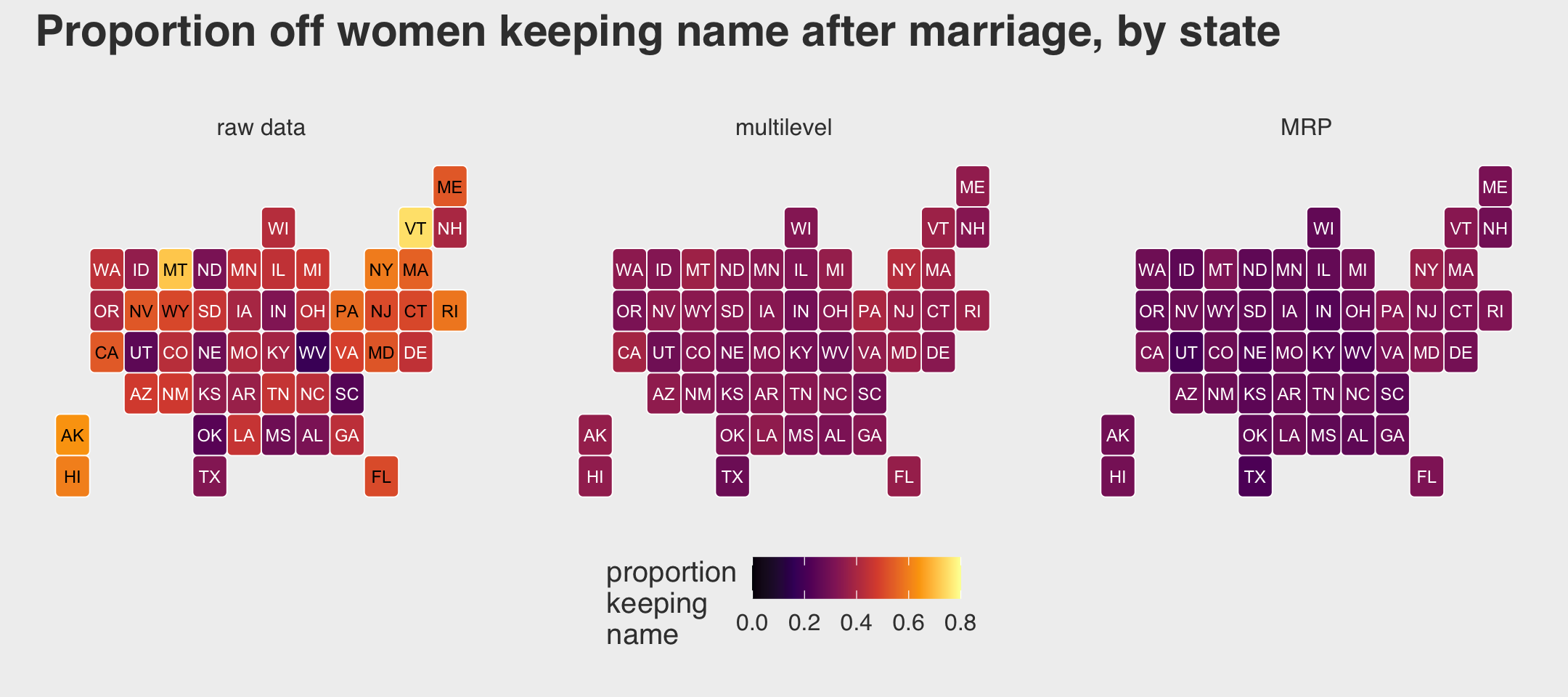 Remember how small the posterior for \(\sigma_\text{state}\) was relative to the other \(\sigma_\text{<group>}\) posteriors? We said that would imply more aggressive regularization across states. You can really see that regularization in the panels showing the multilevel and MRP estimates. They are much more uniform than the proportions from the raw data, which are all over the place. This is why you use multilevel models and/or stratify. When you divide the responses up at the state level, the proportions get jerked all around due to small and unrepresentative samples. Even with the regularization from the multilevel partial pooling, you can still see some interesting differences in the multilevel and MRP panels. Both suggest women keep their maiden names in relatively low proportions in Utah and relatively high proportions in New York. For those acquainted with American culture, this shouldn’t be a great surprise.