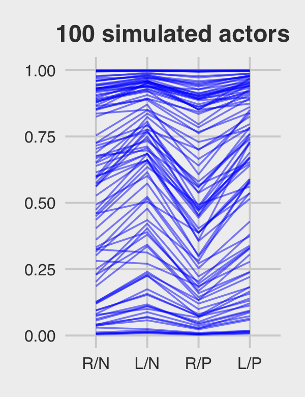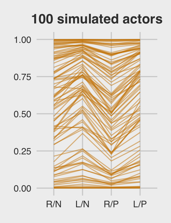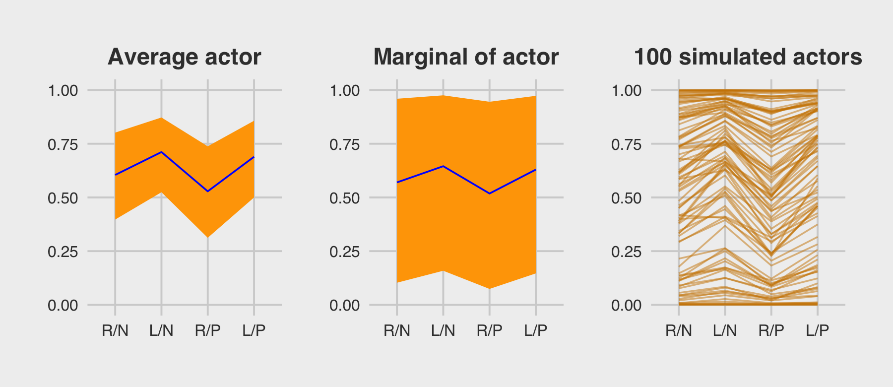fitted()version of the code for the third panel is cumbersome. Indeed, this in one of those cases where it seems more straightforward to work directly with theas_draws_df()output, rather than withfitted(). The workflow in this section from previous editions of this ebook was more streamlined and superficially seemed to work. However, fellow researcher Ladislas Nalborczyk kindly pointed out I was taking 100 draws from one new simulatedactor, rather than one simulated draw from 100 new levels ofactor. To my knowledge, if you want 100 new levels ofactorAND want each one to be from a different posterior iteration, you’ll need a lot of post-processing code when working withfitted().↩︎