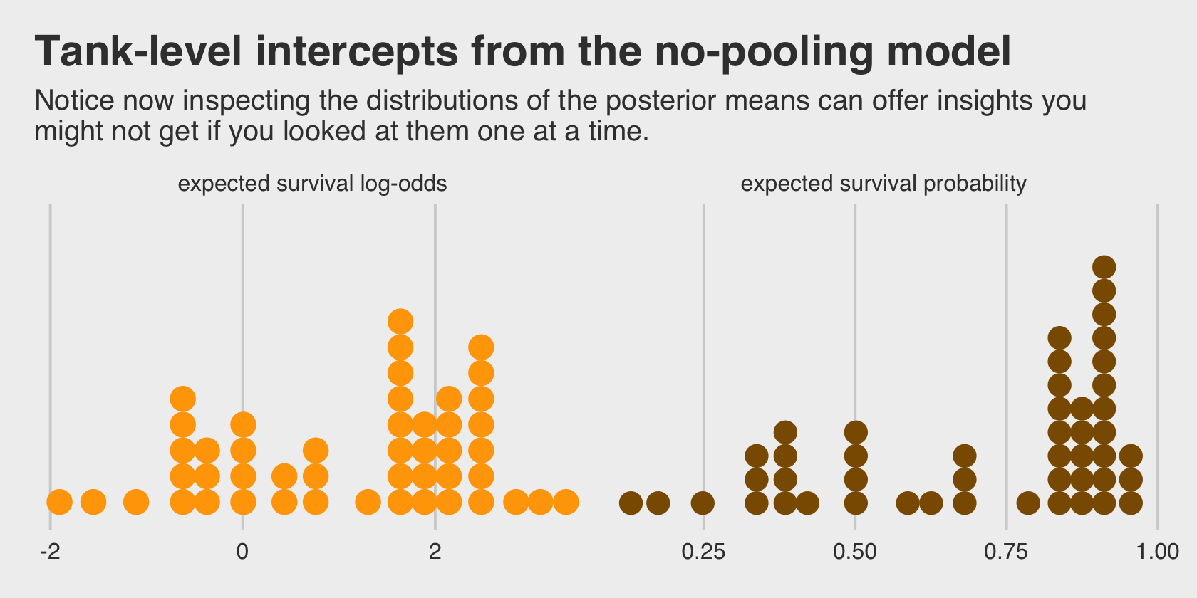 \[\begin{align*} \text{surv}_i & \sim \operatorname{Binomial}(n_i, p_i) \\ \operatorname{logit}(p_i) & = \alpha_{\text{tank}[i]} \\ \alpha_j & \sim \operatorname{Normal} (0, 1.5) & \text{for } j = 1, \dots, 48, \end{align*}\]