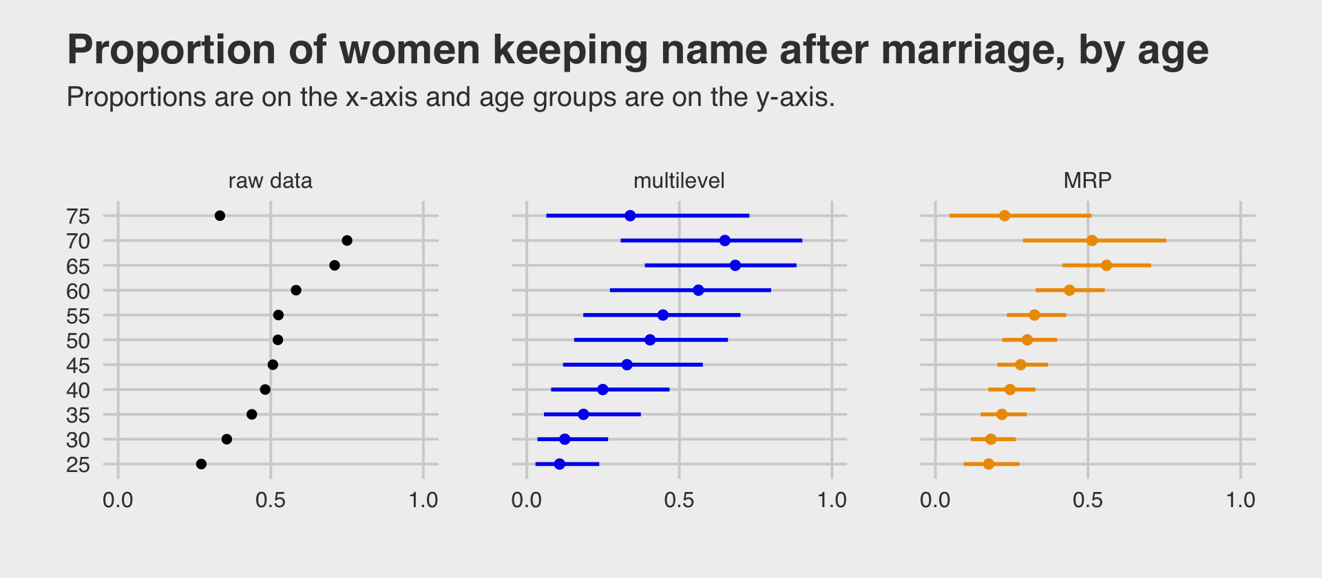 Both multilevel and MRP estimates tended to be a little lower than the raw proportions, particularly for women in the younger age groups. Alexander mused this was “likely due to the fact that the survey has an over-sample of highly educated women, who are more likely to keep their name.” The MRP estimates were more precise than the multilevel predictions, which averaged across the grouping variables other than age. All three estimates show something of an inverted U-shape curve across age, which Alexander noted “is consistent with past observations that there was a peak in name retention in the 80s and 90s.”