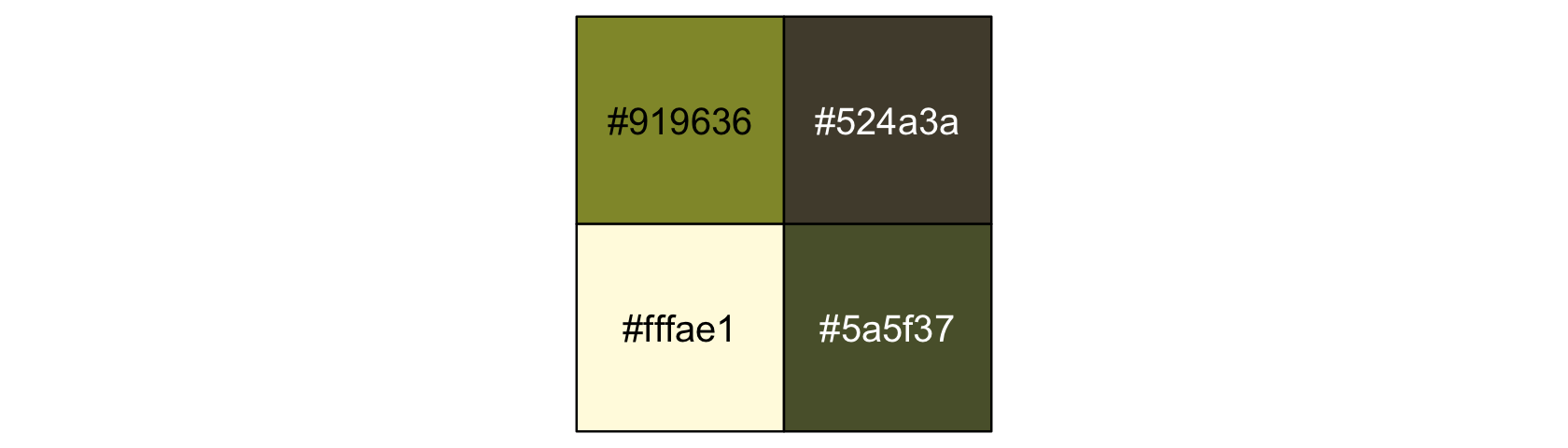 canva_pal("Green fields")(4)## [1] "#919636" "#524a3a" "#fffae1" "#5a5f37"