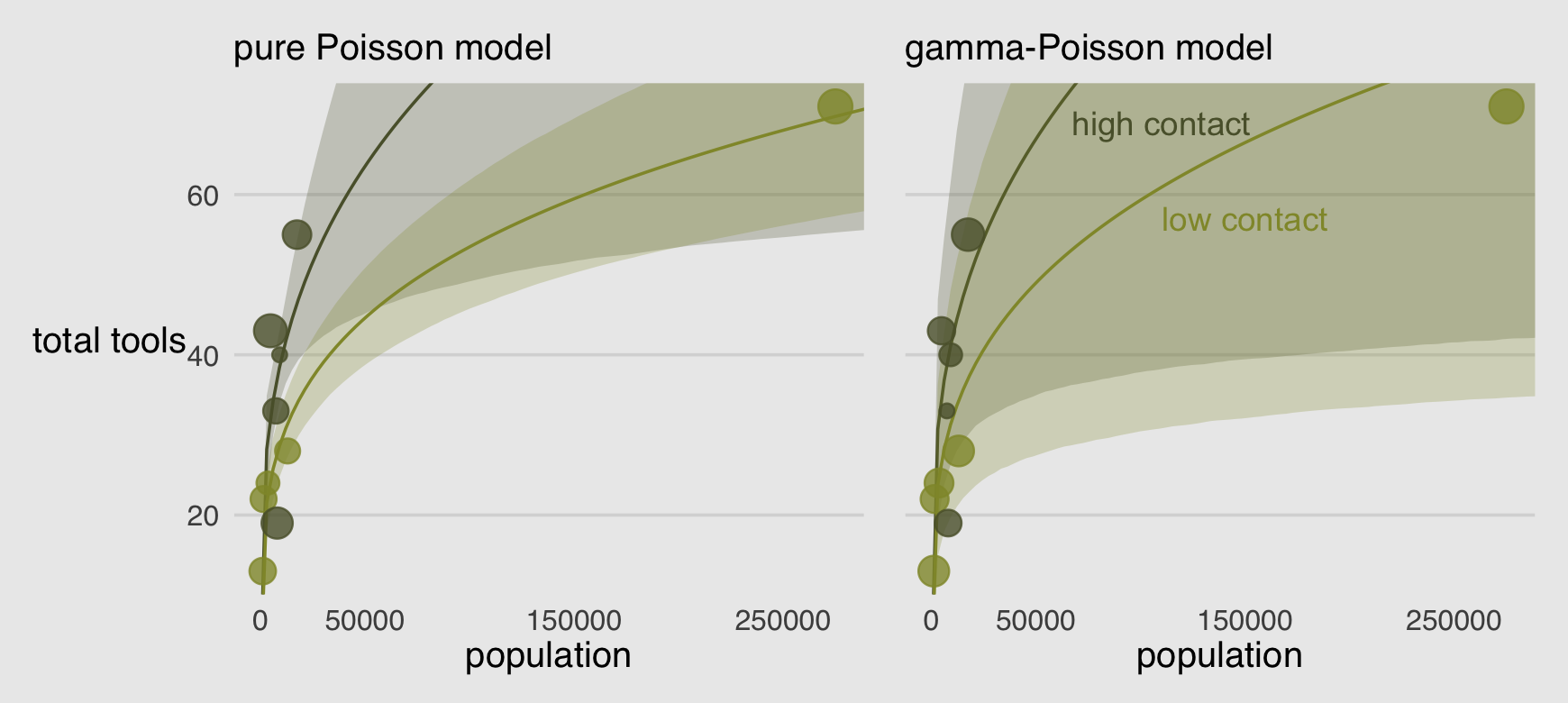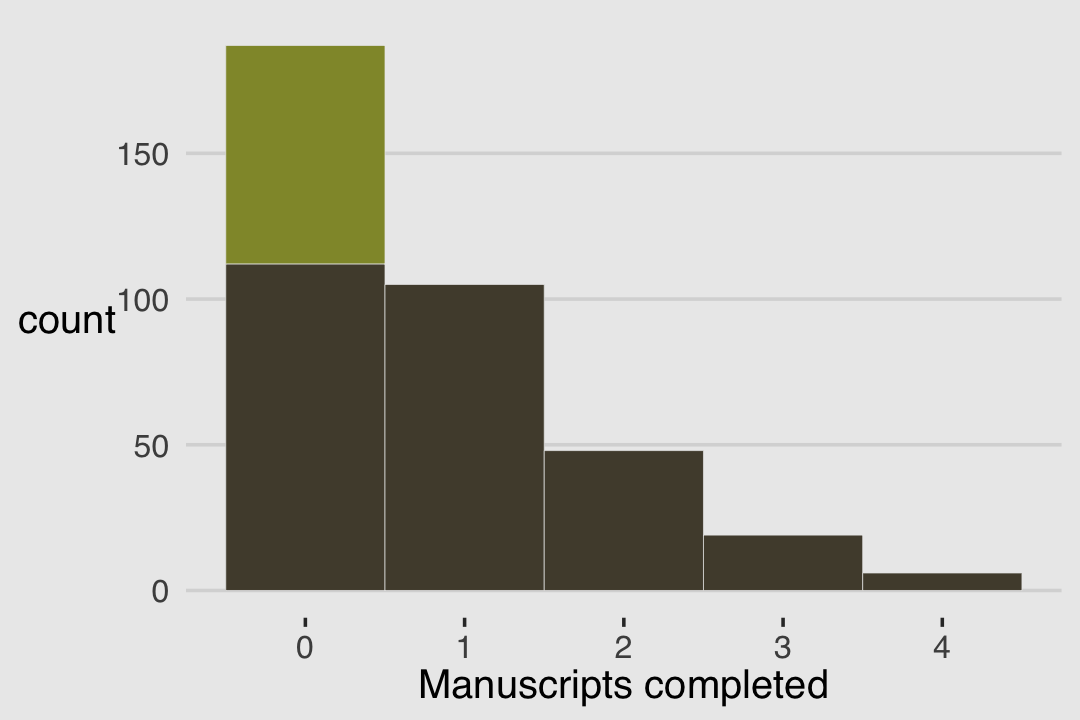 When counts arise from a mixture of different processes, then there may be more variation–thicker tails–than a pure count model expects. This can again lead to overly excited models. When counts are more variable than a pure process, they exhibit over-dispersion. The variance of a variable is sometimes called its dispersion. For a counting process like a binomial, the variance is a function of the same parameters as the expected value. For example, the expected value of a binomial is \(Np\) and its variance is \(Np(1 - p)\). When the observed variance exceeds this amount–after conditioning on all the predictor variables–this implies that some omitted variable is producing additional dispersion in the observed counts.