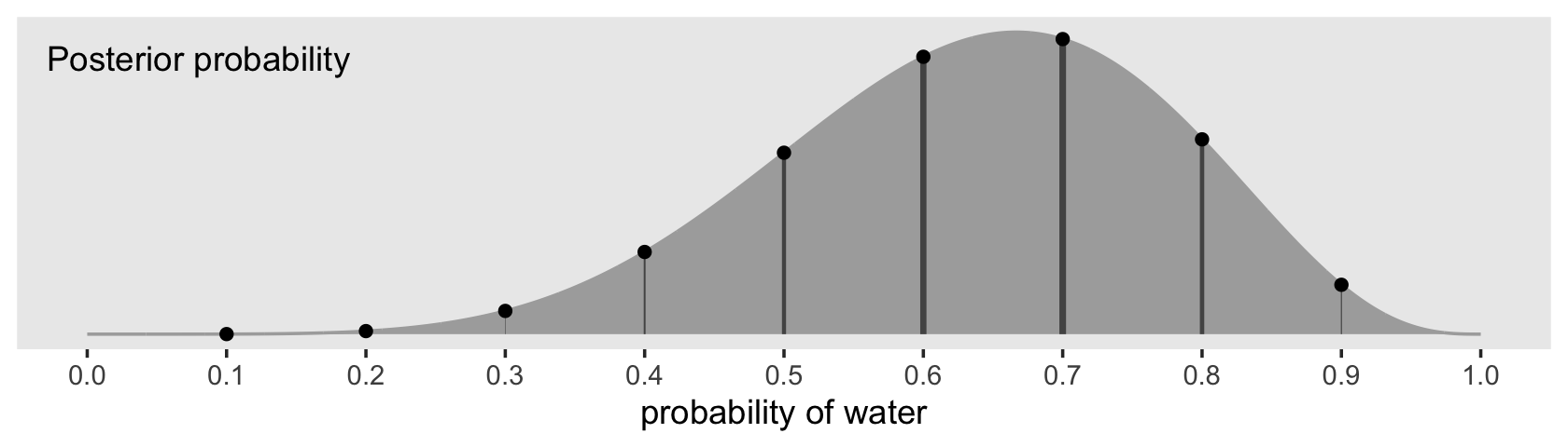 The posterior distribution is a probability distribution. And like all probability distributions, we can imagine drawing samples from it. The sampled events in this case are parameter values. Most parameters have no exact empirical realization. The Bayesian formalism treats parameter distributions as relative plausibility, not as any physical random process. In any event, randomness is always a property of information, never of the real world. But inside the computer, parameters are just as empirical as the outcome of a coin flip or a die toss or an agricultural experiment. The posterior defines the expected frequency that different parameter values will appear, once we start plucking parameters out of it. (McElreath, 2020a, p. 50, emphasis in the original)