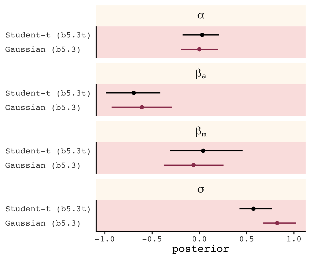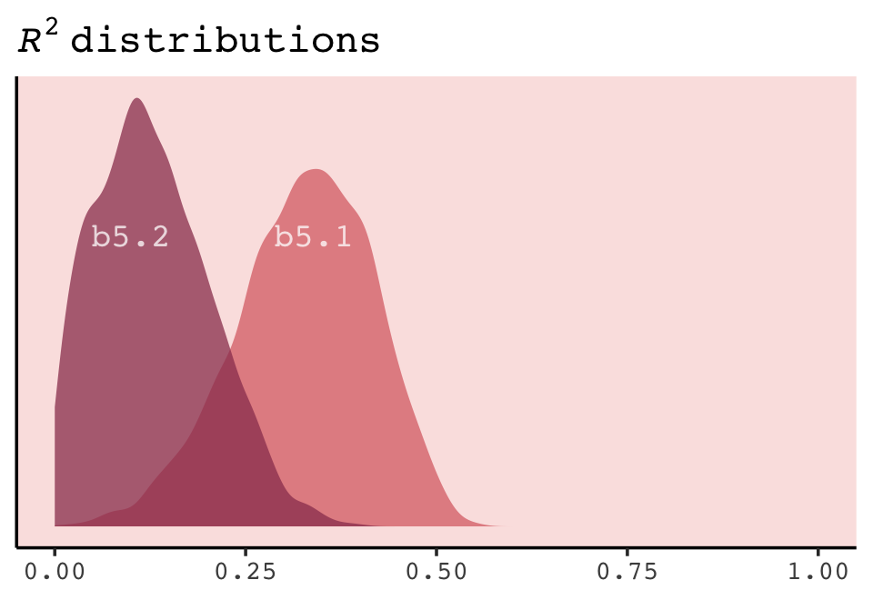 At the beginning of the chapter (pp. 193–201), McElreath introduced \(R^2\) as a popular way to assess the variance explained in a model. He pooh-poohed it because of its tendency to overfit. It’s also limited in that it doesn’t generalize well outside of the single-level Gaussian framework, which will be a big deal for us starting in Chapter 10. However, if you should find yourself in a situation where \(R^2\) suits your purposes, the brms bayes_R2() function might be of use. Simply feeding a model brm() fit object into bayes_R2() will return the posterior mean, \(\textit{SD}\), and 95% intervals. For example: