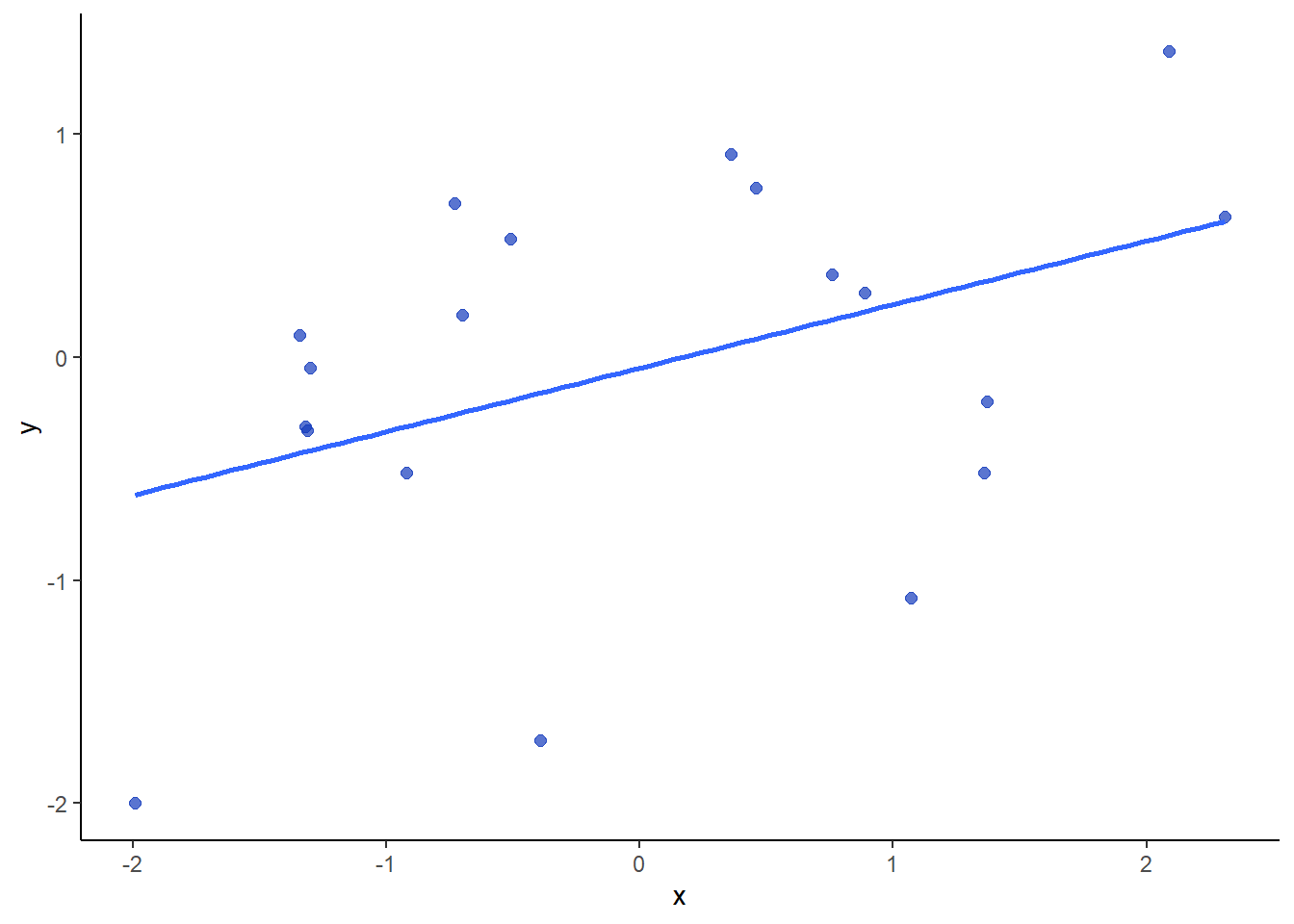 The below image shows a positive correlation of \(r=0.6\), a zero correlation of \(r=0\) and a negative correlation of \(r=-0.6\) for 20 datapoints in each scatterplot.