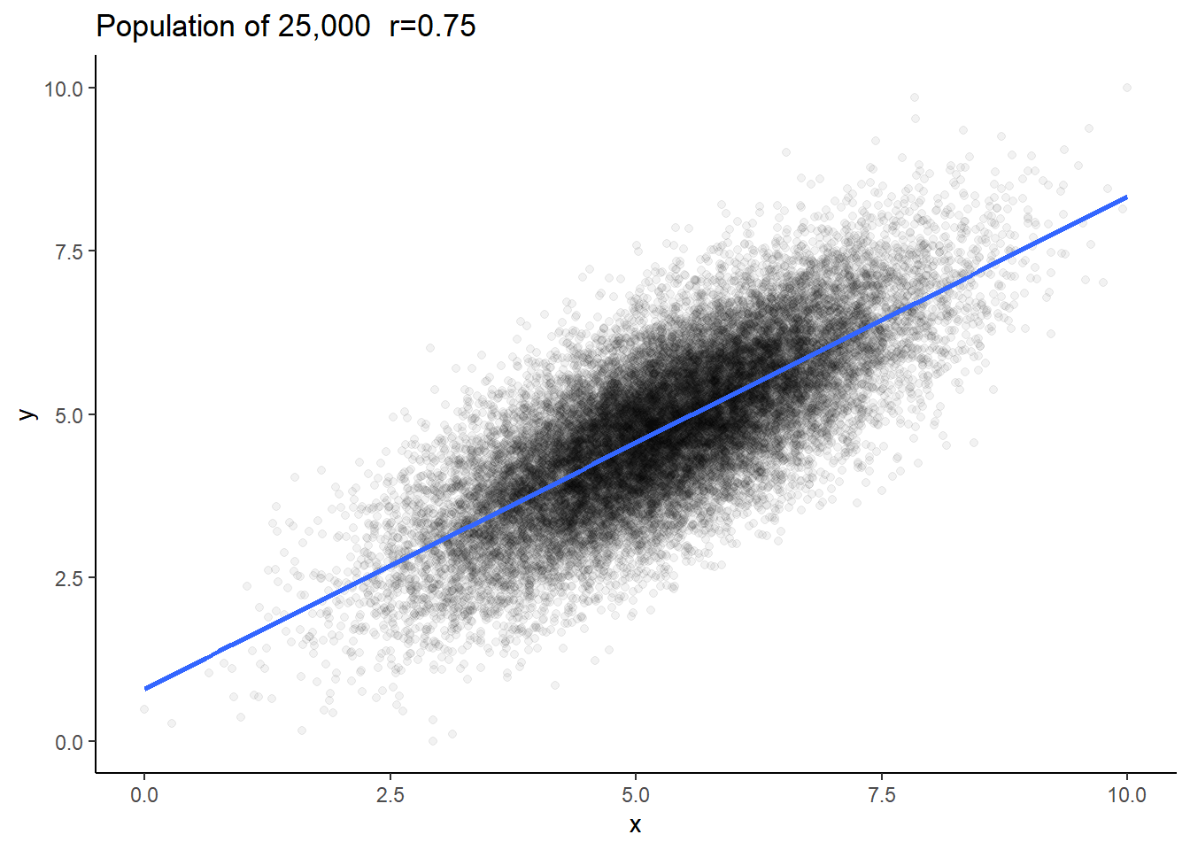 The below image shows scatterplots, each with a sample size of 30. The trendline is to help demonstrate how correlations of different magnitudes look in terms of their association.