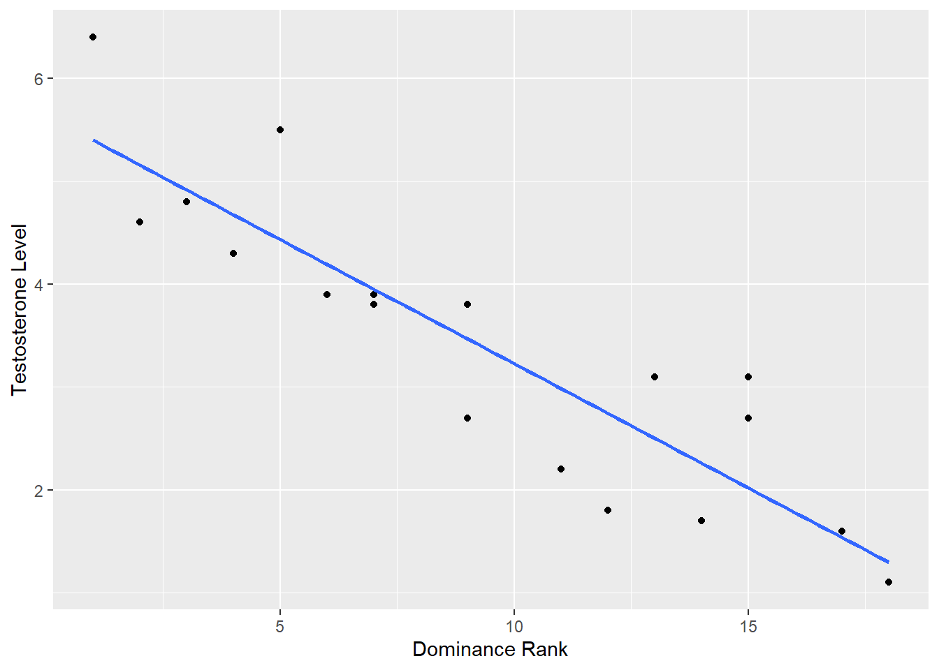 cor(test$drank, test$testosterone, method = "spearman") # rho = -0.91## [1] -0.9083378
