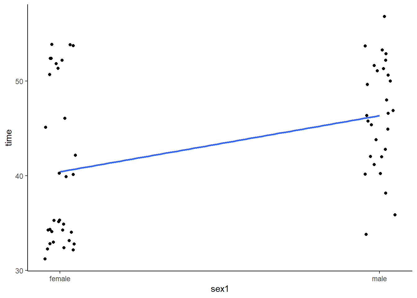 What we have in this plot are individual points representing each cat. The points are jittered to make overlapping datapoints more readable. We have also put a trendline through the data. How was this achieved? Essentially, all the females are given the value 0, and all the males are given the value 1. We then run a Pearson’s correlation using the X values to be 0 or 1, and the Y values to be the time measurement.