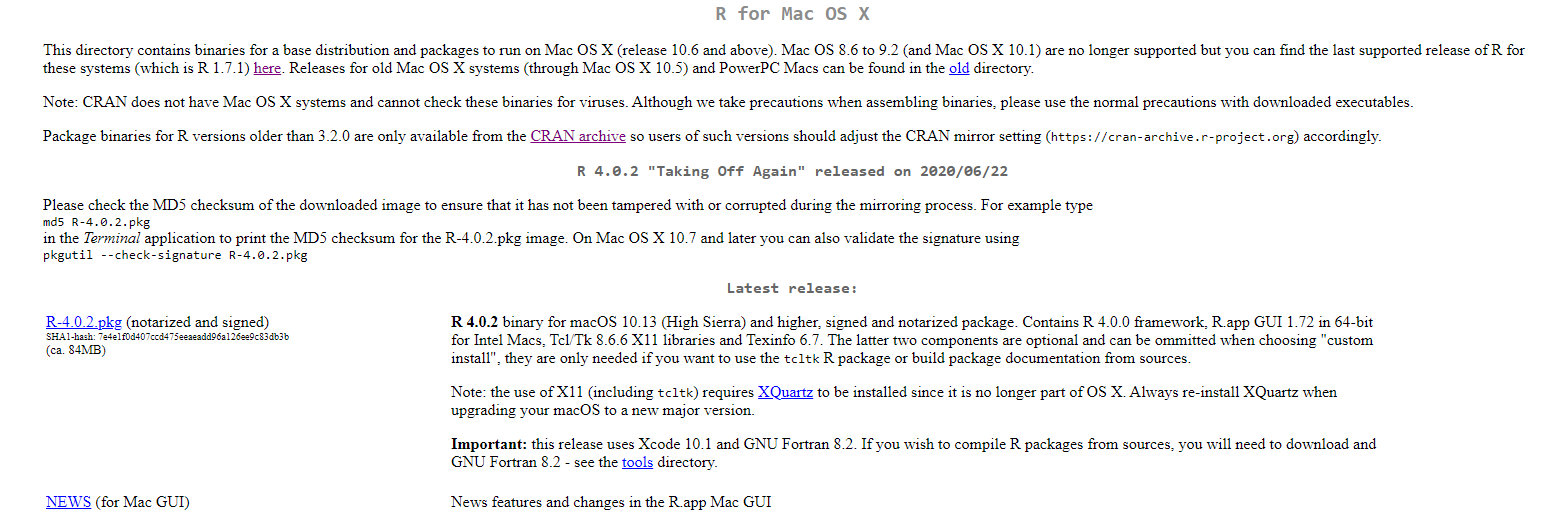 If you have a Mac operating system, then you will see the image below. You want to click on \(\color{blue}{\text{"R-4.0.2.pkg"}}\). If a more recent version of R is available, then the version number will be higher than 4.0.2 - click on this instead.