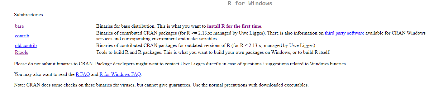 For windows users, after you have clicked the appropriate link below, you will see the following screen and you should click on \(\color{blue}{\text{"install R for the first time"}}\).
