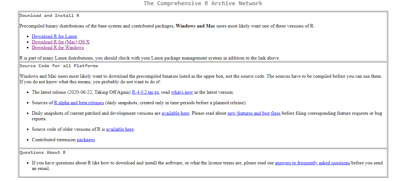 You want to click the link that says \(\color{blue}{\text{"Download R 4.0.2 for Windows"}}\) that is right at the top of the screen. If the version is more recent than 4.0.2, then click on that instead - just make sure it’s the link at the very top of the page in the gray box. This will start downloading R. Just follow the instructions. You do not need to change any of the default settings, just click accept for each. One piece of advice is to try and keep R in a folder on your machine such as Documents and don’t put it in a cloud folder. We have seen some students have issues when R has been located in cloud folders.