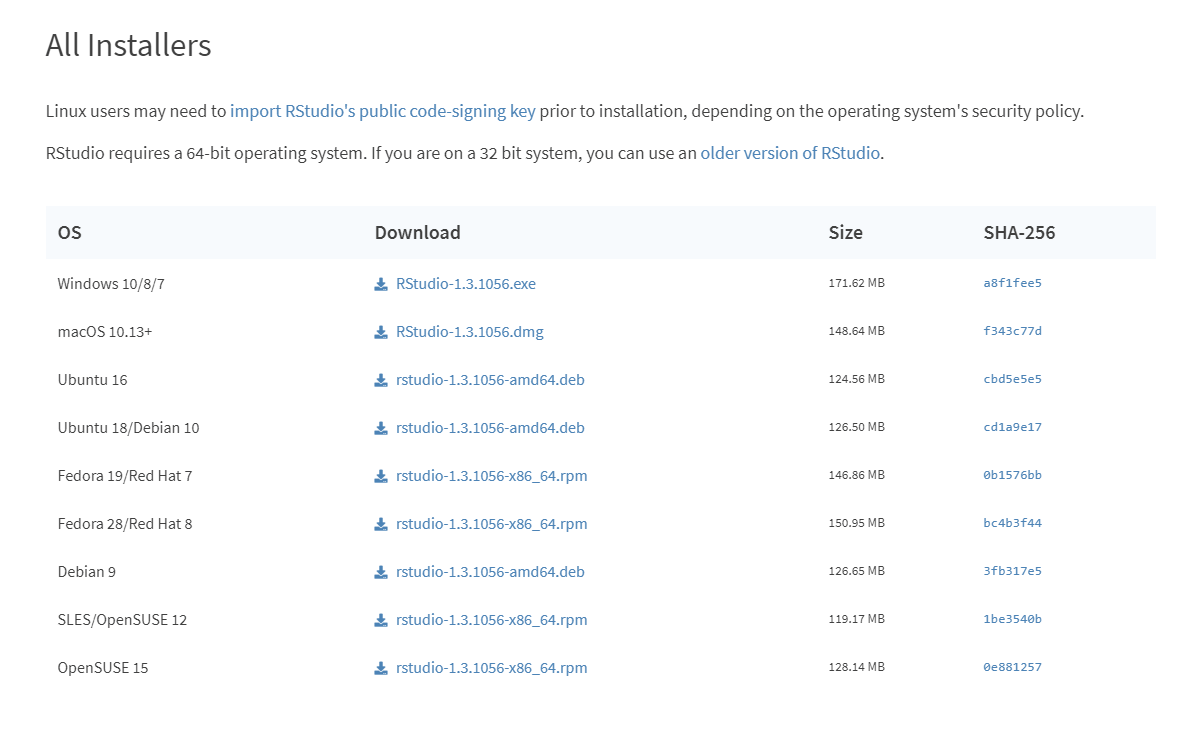 If you have Windows, you will want to click on the first link \(\color{blue}{\text{"RStudio-1.3.1056.exe"}}\). If you have Mac, you should click on the second link \(\color{blue}{\text{"RStudio-1.3.1056.dmg"}}\).