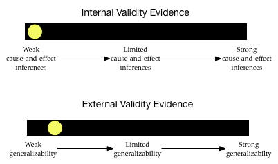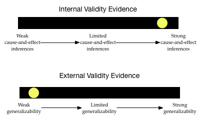 Remember there are two primary questions that you should ask when evaluating a study’s design: (1) How were the study participants selected from the population? This helps us think about the degree of external validity evidence, and (2) How were the selected study participants assigned to conditions? This helps us situate the internal validity evidence.