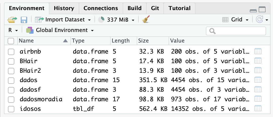 Em Packages estão listados os pacotes instalados. Você pode verificar quais estão carregados e, caso necessário, poderá carregar algum pacote necessário para a sua análise. Também é possível instalar e atualizar pacotes.