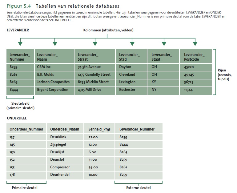 - In onderstaande figuur vind je een voorbeeld van tabellen die relaties voorstellen, inclusief hun primaire en externe sleutel. Merk op dat de primaire sleutel een surrogaatsleutel is. (bron: Figuur 5.4 in Laudon & Laudon, 2015).