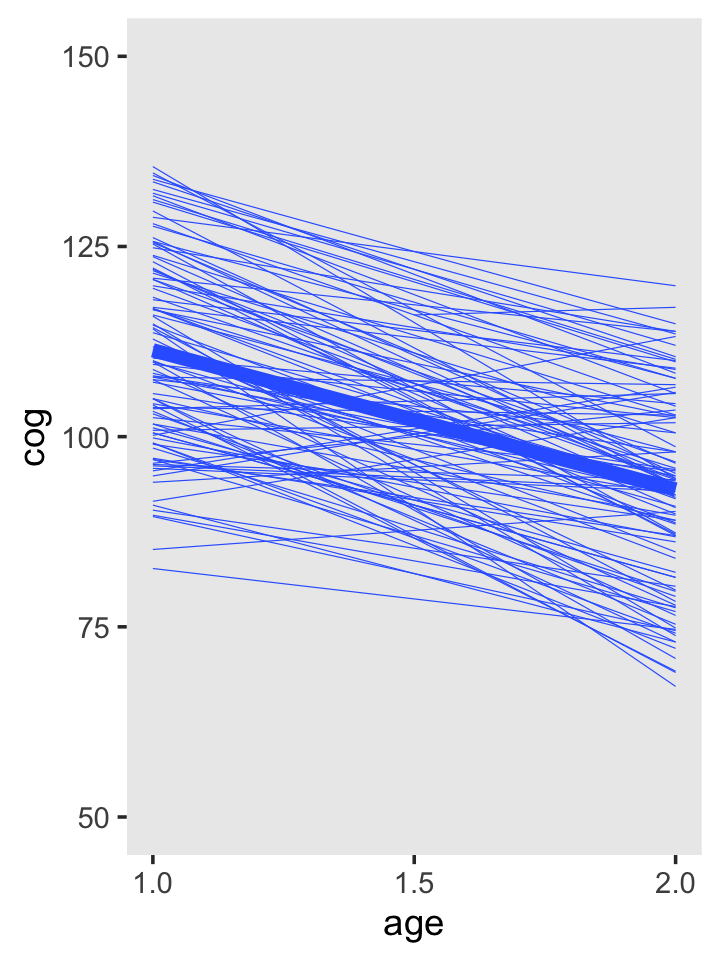 \[ \text{cog}_{ij} = [ \pi_{0i} + \pi_{1i} (\text{age}_{ij} - 1) ] + [\epsilon_{ij}]. \]