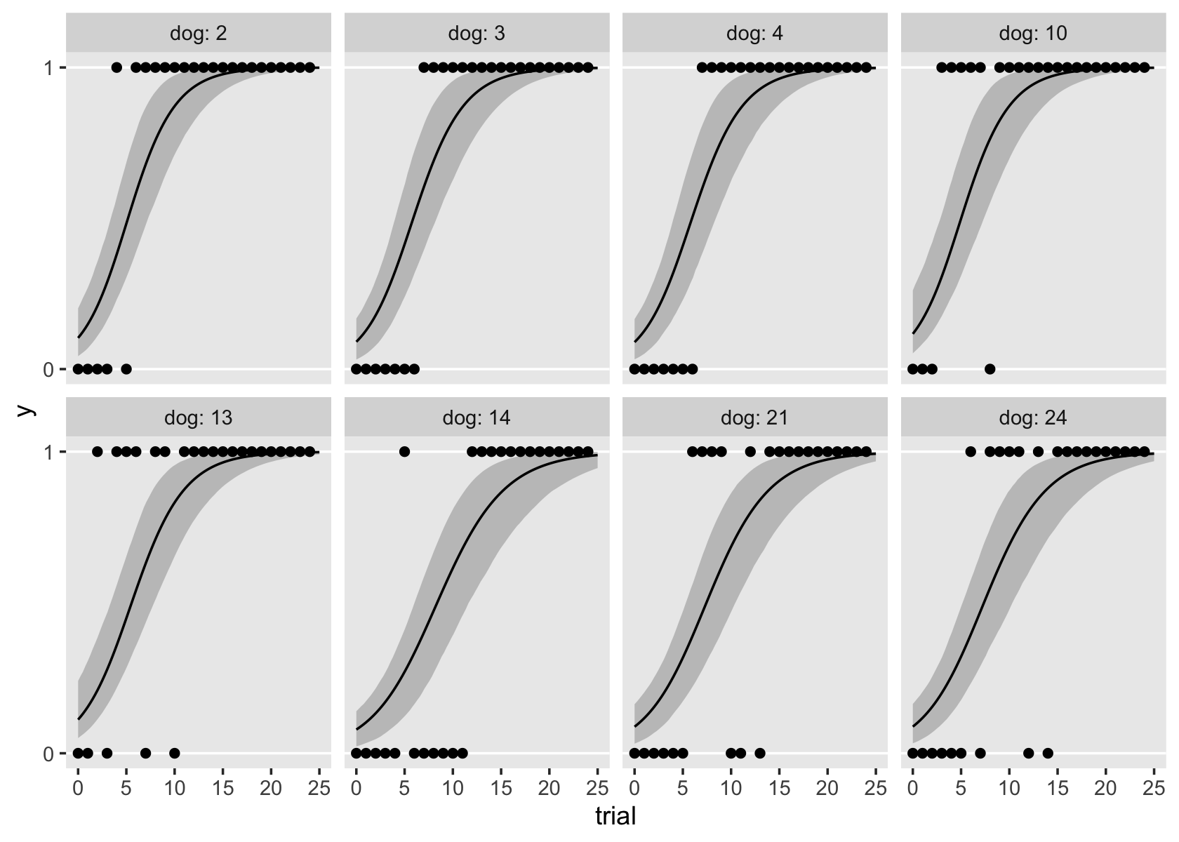 The full bivariate posterior for each dog’s \(\pi\)’s is wider than we’ve depicted with our little 10% ellipses. But even those ellipses give you a sense of their distributions better than simple posterior mean points. It can be hard to interpret these, directly, since both the axes are on the log-odds scale. But hopefully you can at least get a sense of two things: There’s more variability across the \(\pi_{0i}\) parameters than across the \(\pi_{1i}\) parameters (look at the ranges in the axes). Also, there is more variability within the \(\pi_{0i}\) parameters than within the \(\pi_{1i}\) parameters (look at the shapes of the ellipses, themselves). This is the essence of the posterior means and standard deviations of the level-2 \(\sigma\) parameters.