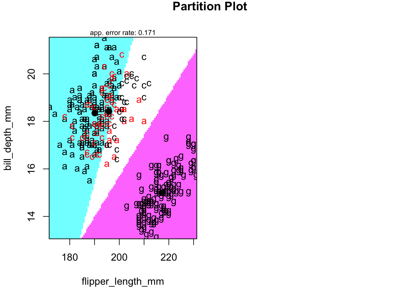 plot(penguins[,c(3,4)],col=penguins$species,pch=16,cex=.8)