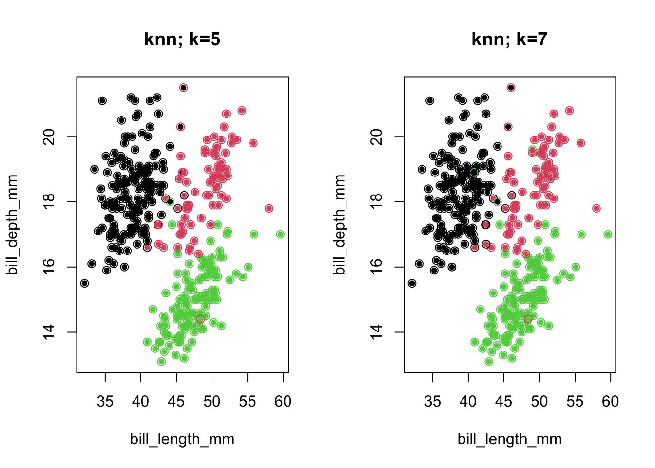 plot(penguins[,c(3,4)],col=penguins$species,pch=16,cex=.8,main='knn; k=7')